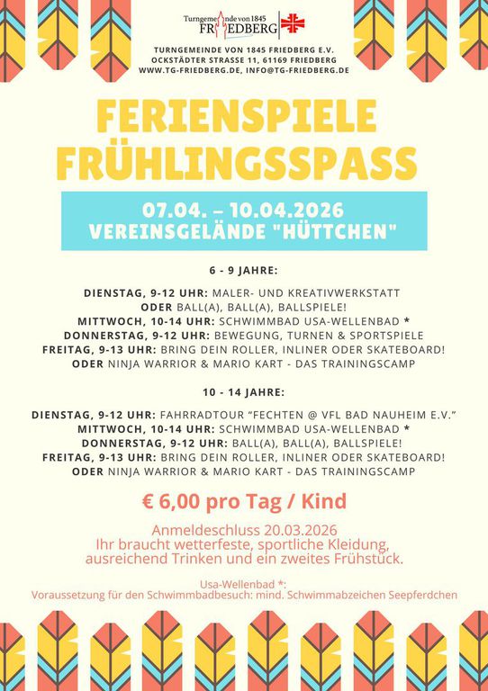 | 07.04.2026 - 10.04.2026 | Ferienspiele Frühlingsspaß | Anmeldung | ||