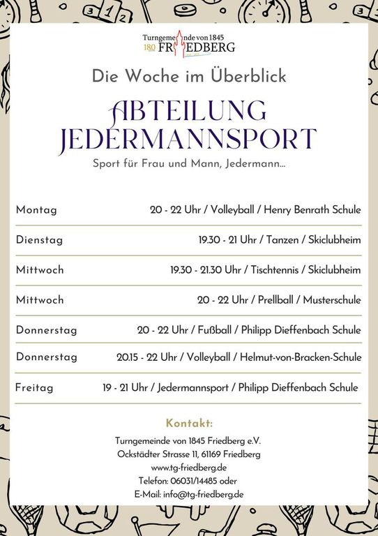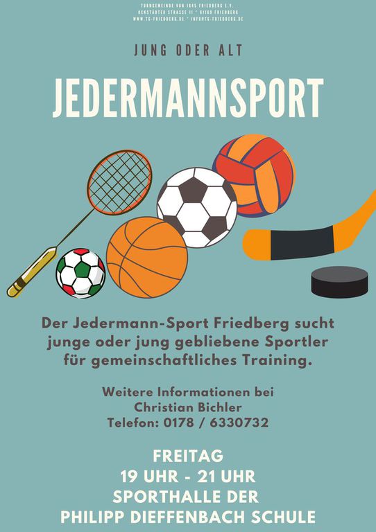 | Jedermannsport | Freitag, 19.00-21.00 Uhr | Philipp-Dieffenbach-Schule | Christian Bichler |