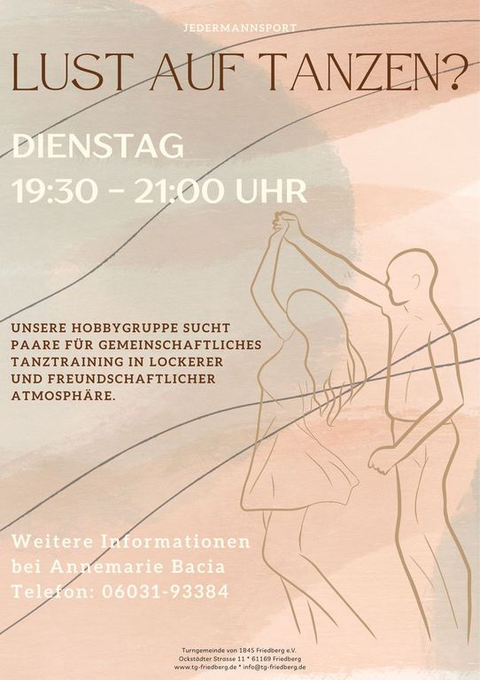 In unserer Gruppe haben Sie die Möglichkeit mit unserer erfahrenen und qualifizierten Übungsleiterin die typische Rhythmik der sowohl klassischen Standardtänze und Lateintänze als auch die Modetänze Discofox und Salsa weiter kennenlernen. Hier können Sie fortgeschrittene Tanzkenntnisse erlangen und die Körperhaltung und den Bewegungsablauf für jeden Tanz stetig verbessern.