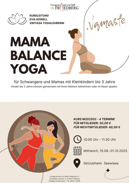 Im Mama Balance Yoga Kurs steht dieses Thema im Zentrum und wird über Übungen mit dem eigenen Körper erfahrbar gemacht. Teilnehmende werden mit dynamischen Übungen durch eine fließende, aufeinander aufbauende Reihe geleitet. In der an Vinyasa Yoga angelehnten Stunde wird Atem und Bewegung in Einklang gebracht und die Aufmerksamkeit auf das Zusammenspiel von Kraftanwendung und Loslassen gerichtet.