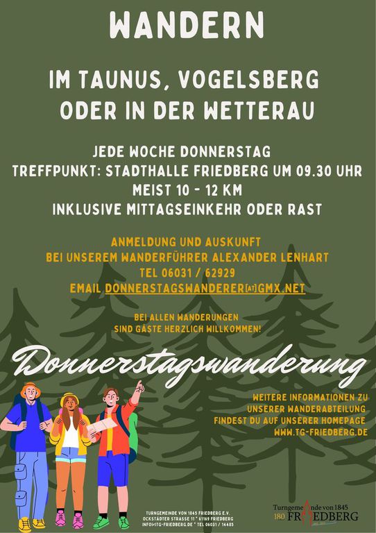 Die 10.00 Uhr Gruppe der Donnerstagswanderer ist im Altersdurchschnitt zwischen 80 und 90 Jahren, wandert vorzugsweise bekannte und flache Strecken in der Wetterau, meistens zwischen 5-7 Kilometer und in Einzelfällen aus etwas mehr.